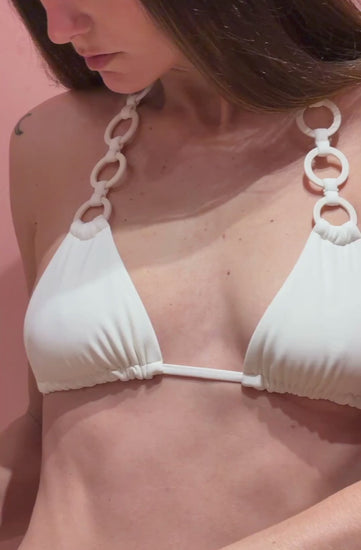 This triangle bikini set features a soft ivory tone with matching ivory ring details along the straps, creating a clean and refined look. The top has an adjustable silhouette for a personalized fit, while the matching bottom includes side ties that enhance the shape.